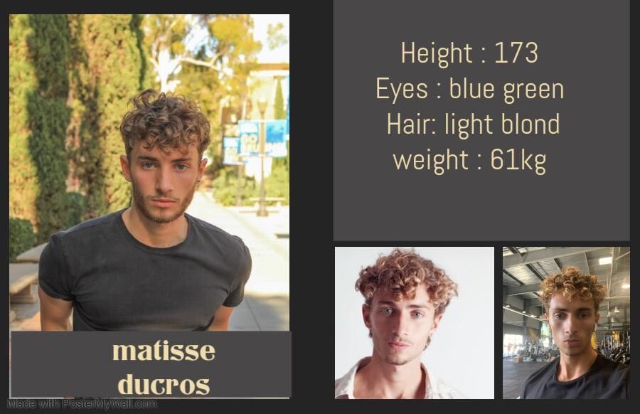 Hi , My name is Matisse Ducros i'm a french actor , i also do modeling and im moving to bangkok in october , in 2024 i was studying acting in los angeles (ucla) were i did some student movies before coming back for a year in france were i did a commercial for a dating app (still in production) . I am searching for a lot of opportunities in asia and i hope that we will collaborate in the future for amazing opportunities . best regards , matisse